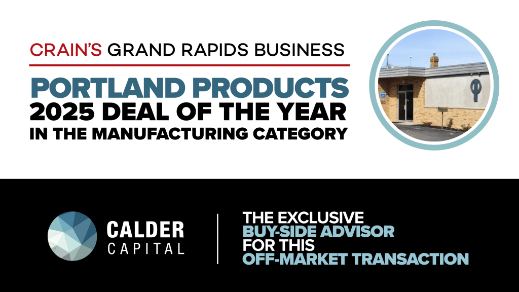 Calder Capital is proud to announce that the acquisition of Portland Products of Portland, MI, by Rick Slater and Ben Greve, backed by Sleeping Giant Capital of Kalamazoo, MI, has been named Crain’s Grand Rapids 2025 Deal of the Year in the Manufacturing category. This prestigious recognition by Crain’s serves to highlight transactions that create […]