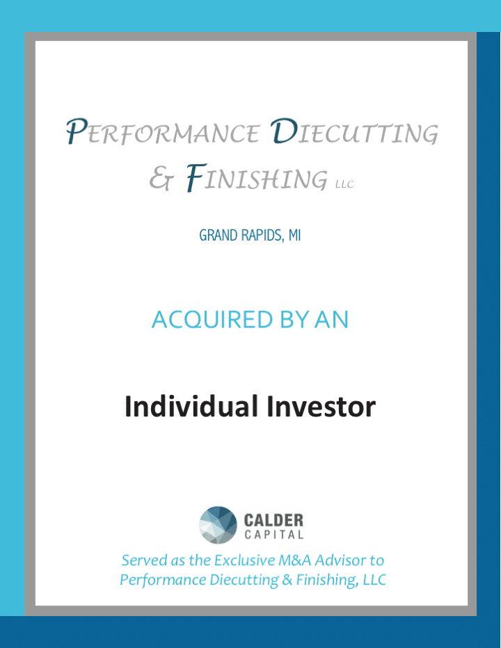 December 2018 – Calder Capital, LLC, a mergers & acquisitions firm focused on lower middle market industrial and service transactions, is pleased to announce the successful acquisition of Grand Rapids, MI-based Performance Die Cutting & Finishing, LLC.