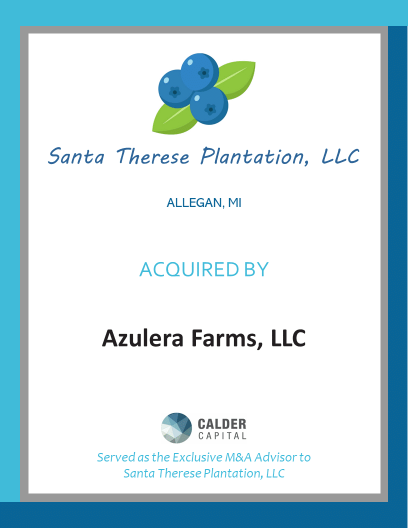 Calder Capital is pleased to announce the successful sale of the Santa Therese Plantation, LLC to Azulera Farms, LLC. The acquired farm consists of 27+ acres of blueberries and a property parcel featuring roughly 60 acres located in Allegan County, MI.