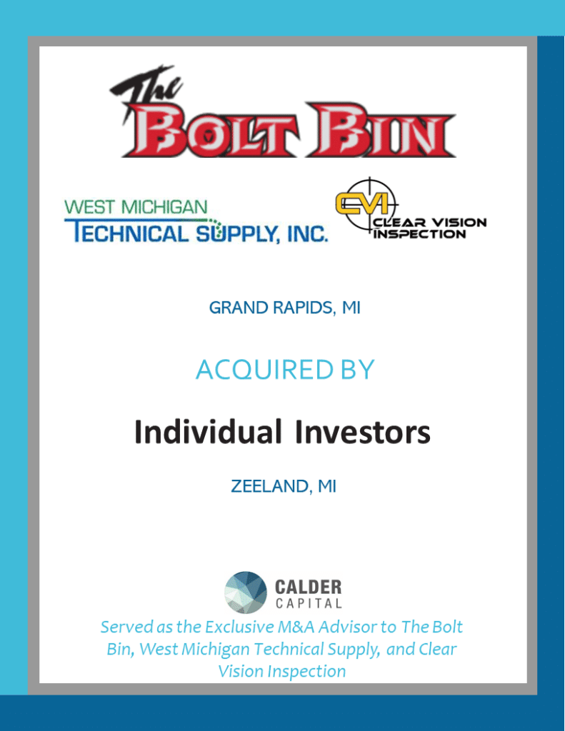 Calder Capital, LLC, served as the exclusive Mergers and Acquisitions partner to The Bolt Bin, West Michigan Technical Supply, Inc., and Clear Vision inspection.