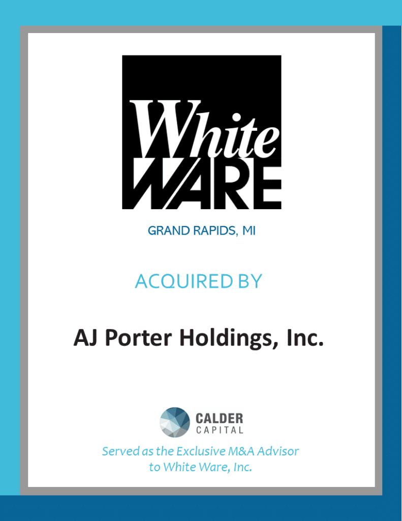 When asked about reasons for the partnership, Mr. Whitehouse commented, “Michael and I truly enjoy servicing our customers daily, and plan to continue to do so for the next few years. We knew that transitioning out of a business could take a long time and in our mid-60s were trying simply to be proactive about the process. We are very happy that Calder Capital was able to locate Andy Porter so quickly. He has the right skills and vision to make White Ware more successful than ever and we couldn’t be happier about partnering with him to continue growing the business.”